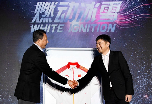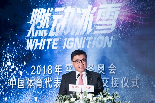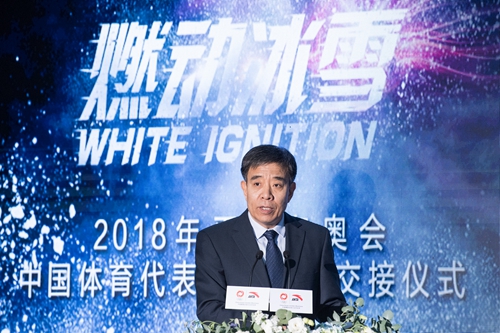 国家体育总局副局长、中国奥委会副主席李颖川先生向安踏体育用品有限公司董事局主席兼首席执行官丁世忠先生交接2018年平昌冬奥会中国代表团领奖装备冠军龙服