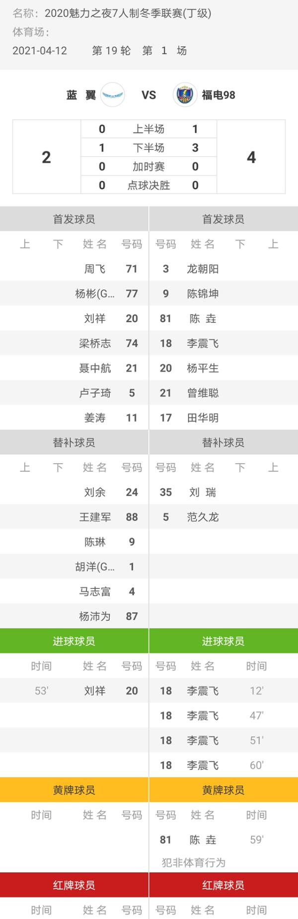 4月12日晚,由贵州体育在线主办,贵州省足球协会、贵阳奥林匹克体育中心指导,贵阳奥林匹克赛事运营中心协办的魅力之夜2020赛季7人制足球冬季联赛(丁级组)第十九轮的第一场比赛在黔灵山体育公园进行,蓝翼2-4福电98。